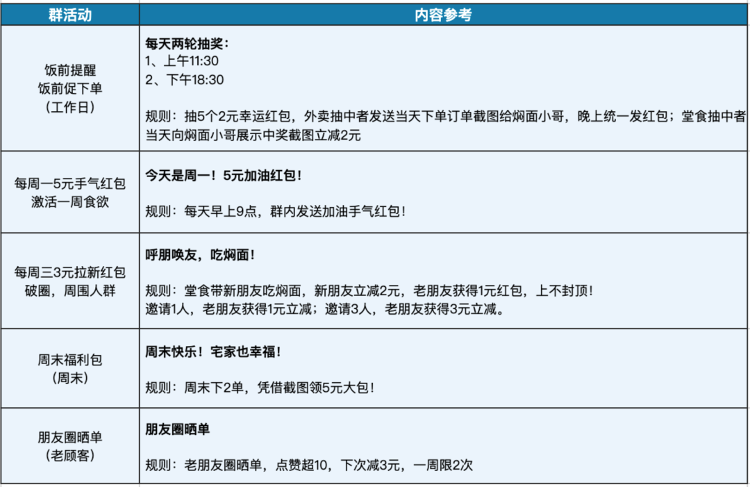 在微信群的设计玩法上,主要分为群名称设计、群公告设计、群日常活动设计三个板块,具体可以参考以下这张图,各位老板们可以根据自己的实际节奏、菜品情况做调整。