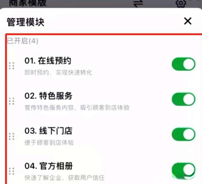 把所有的模块都关掉,只保留图中四个模块就可以了(也可根据自身需要选择)。【官方相册】我们可以选几张相关照片上传;【特色服务】可以添加一些店铺里提供免费WiFi、免费茶水等服务。